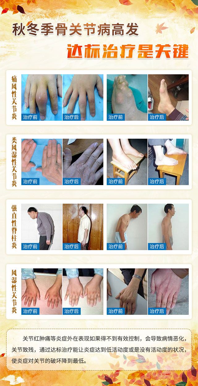 时值秋季,天气逐渐转凉,昼夜温差大,多发骨关节疾病。研究表明,风湿关节疾病最易在秋凉时节发病或病症加重,最主要的特点是关节的红肿热痛。随着疾病的进展,会发展到关节畸形和功能受限,甚至会影响到身体其他系统的健康。有关研究显示,类风湿性关节炎、强直性脊柱炎等风湿关节疾病其致残率在发病1年内可达20%,10年内可达60%。所以说早诊早治十分必要,而要尽早控制疾病,必须做到达标治疗(即:让疾病达到低活动度或是没有活动度的状况,使疾病对关节的破坏降到最低)。