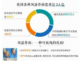 在众多原因导致的残疾中,因痛风风湿骨病致残的患者群体日渐庞大。据国家风湿病诊疗数据中心(CRDC)统计,目前我国约有2亿多人常年遭受痛风风湿骨病的困扰!其中超过8000万的患者由于诊治不及时或不规范而错失治疗关键期,导致病情反复发作,最终引发关节畸形残疾…